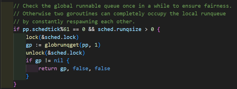 回想八股:GMP 模型下,内核线程 M 每调度 61 次本地队列 p 中的协程后,都会去全局队列中获取一个 g 来执行。